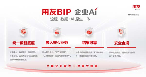 用友BIP企业AI打造了“中国企业软件X中国大模型”的企业数智化双轮引擎,将AI技术与企业业务深度融合,构建数据驱动、智能运营的数智企业新范式,为企业提供覆盖全领域全场景的智能化解决方案,助力企业加速数智化转型与升级。其中,用友BIP企业AI具备统一数智底座、嵌入核心业务、结果可靠和安全可靠四大特性,以业务为导向,降低AI应用门槛、确保AI应用安全可靠和可持续,让AI能力真正落地到实际业务中,实现智能运营。