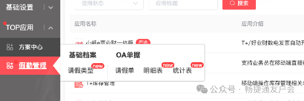 4,安装完成之后,在左侧目录栏内,TOP应用下,可看到已经安装完成的“假勤管理”。可根据实际业务情况自定义请假类型,并将请假单应用于企业协同;