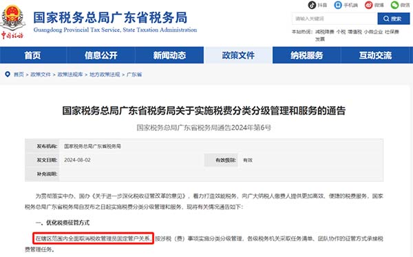 为贯彻落实中办、国办《关于进一步深化税收征管改革的意见》,向广大纳税人缴费人提供更加高效、便捷的税费服务,国家税务总局广东省税务局自发布之日起实施税费分类分级管理和服务,现将有关情况通告如下:
